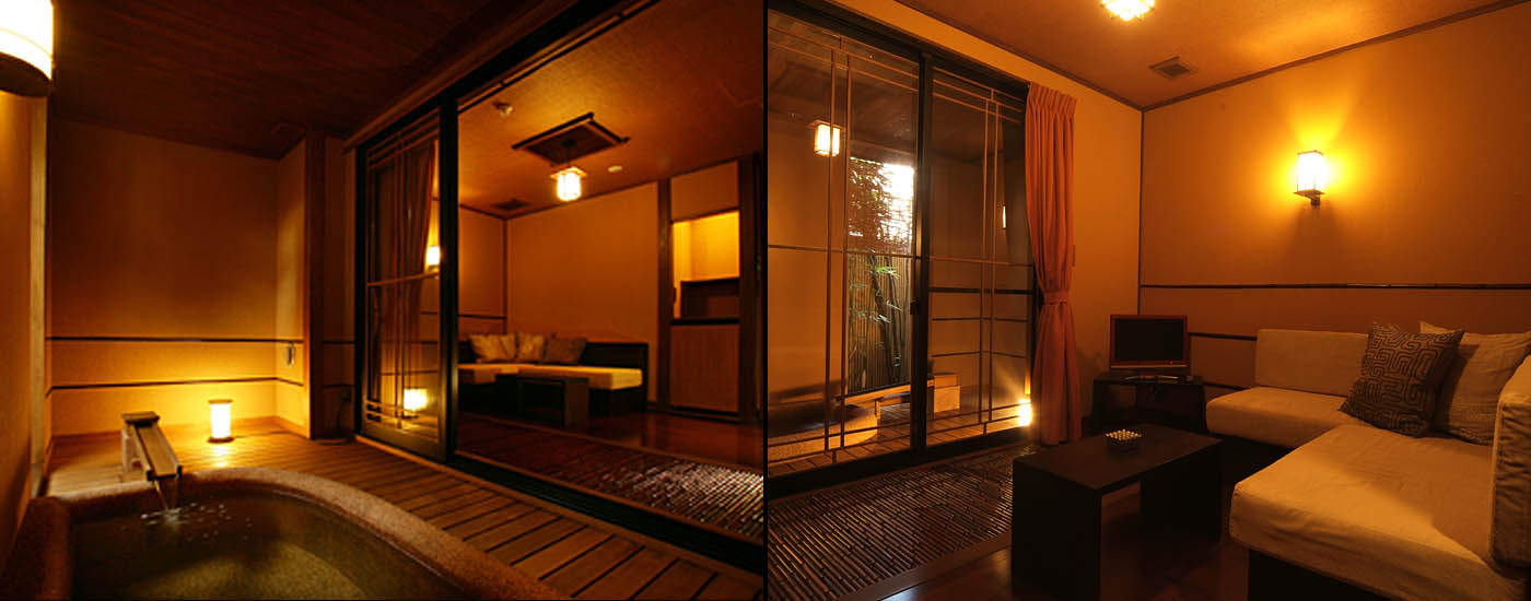 露天風呂が備え付けている83㎡の客室です。主室・寝室・リビングとそれぞれのお部屋が独立しているので、